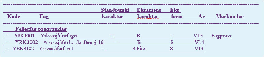 Fellesfag og programfag som er tatt ut over nasjonalt fastsatt fag- og timefordeling for et yrkesfaglig løp, fører dere som angitt under fag ut over minstekravet i punkt 4.2. I tillegg fører dere vitnemålsmerknad VMM28 «Den fireårige opplæringen er gjennomført i nært samarbeid mellom skole og bedrift etter modell for «YSK», jf. vedlegg.»