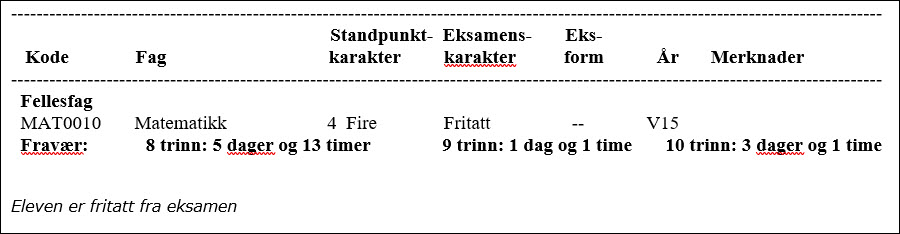 For elever som følger læreplan i norsk der de skal ha halvårsvurderingen i én samlet karakter i norsk hovedmål skriftlig, men egen vurdering i norsk skriftlig sidemål det siste skoleåret (10. trinn), vil det være ulik føring på trinnene (8., 9. og 10. trinn). For underveisvurdering i norsk hovedmål skriftlig fører dere norsk hovedmål skriftlig med fagkode og navn. Dere skal føre elevens karakter i skriftlig. I tillegg skal dere føre FAM59 «Vedtak fritak oppl.sidemål». Fagmerknaden skal ha som formål å synliggjøre at eleven har et vedtak om fritak fra opplæring i skriftlig sidemål, f. eks vil dette være formålstjenlig ved et skolebytte. Først når eleven etter læreplanen skal ha egen vurdering i norsk sidemål skriftlig, fører dere sidemål med fagkode og navn og fører «Fritatt» i rubrikken for standpunktkarakter. I rubrikken år fører dere det året faget naturlig skulle vært avsluttet. I tillegg fører dere FAM01 «Fritatt fra opplæring».