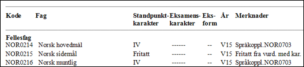Dersom eleven ikke har gått over til ordinær læreplan i norsk ved avsluttet grunnskoleopplæring, skal dere likevel føre koden for det ordinære norskfaget. I rubrikken for standpunktkarakterer fører dere «Ikke vurderingsgrunnlag» (IV) og FAM41 «Språkopplæring. <fagkode grunnleggende norsk og/eller fagkode morsmål >». Der angir dere etter hvilken læreplan den særskilte språkopplæringen er gitt, og på hvilket språknivå i læreplanen eleven avsluttet opplæring.