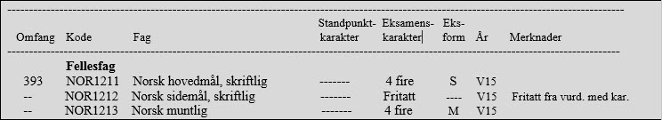 Eksempel: Privatist som er fritatt fra vurdering i norsk sidemål: