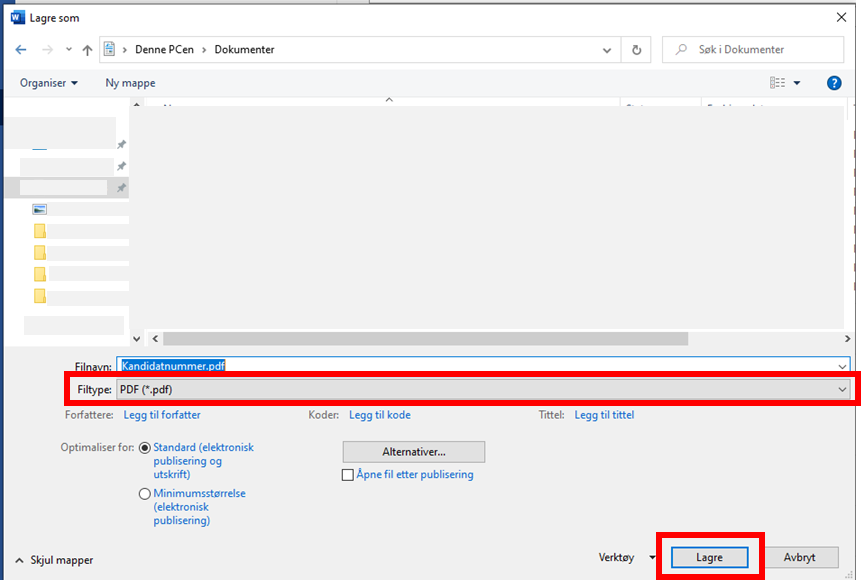 - I vinduet som dukker opp, velg plassering for dokumentet ditt og «PDF (*.pdf)» som filtype.