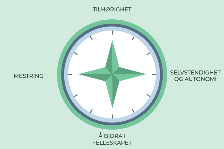 Som i et kompass kan de fire faktorene plasseres langs to hovedakser. Tilhørighet og å bidra i felleskapet, er den ene hovedaksen. For å kunne bidra i fellesskapet, må elevene oppleve å høre til, og motsatt. For å oppleve tilhørighet, må elevene få mulighet til å bety noe i dette fellesskapet.