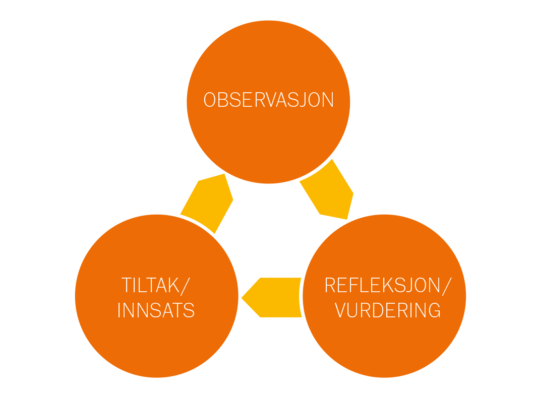 Observasjoner er grunnlaget for refleksjoner og vurderinger. Dette blir utgangspunkt for videre arbeid i form av valg, igangsetting og gjennomføring av tiltak. Som det framgår av figuren, er det ikke snakk om en sluttet sirkel eller et avsluttet arbeid. Prosessen foregår gjentatte ganger.