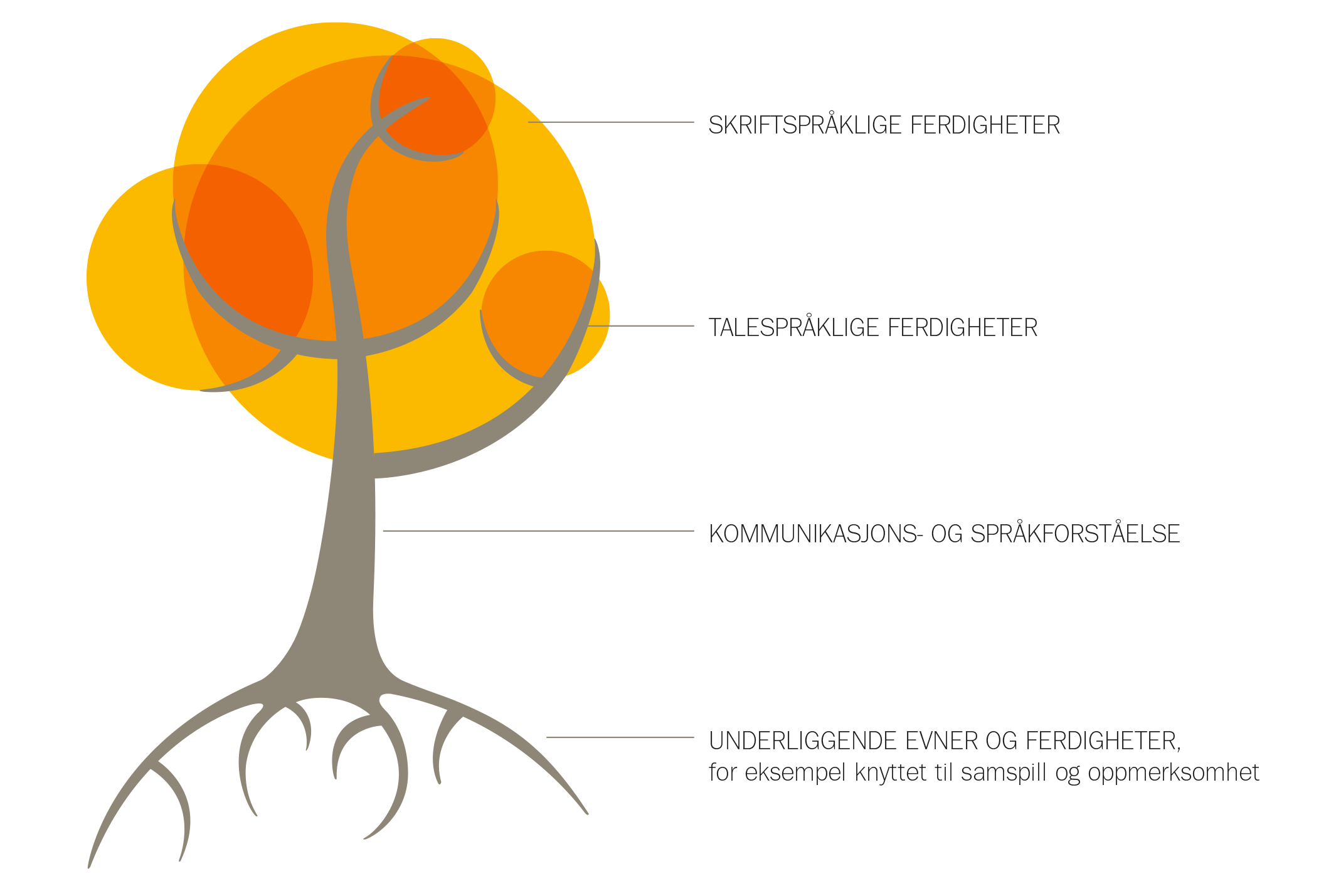 Å tilegne seg språk kan illustreres ved hjelp av et tre. Røtter, stamme, grener, kvister og blader henger nøye sammen, påvirker hverandre og utgjør en helhet. Slik er det også med språket. For eksempel er barns språk avhengig av noen grunnleggende forutsetninger på samme måte som treets vekst er avhengig av røttene.