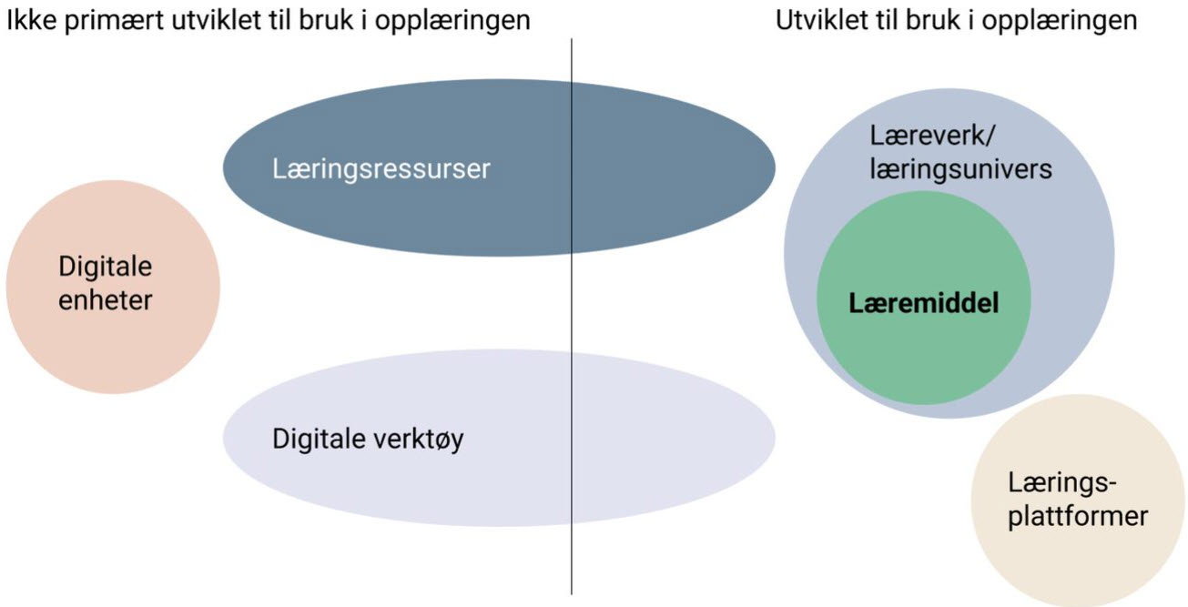 Illustrasjonen viser en horisontaldelt flate der høyre halvdel har overskriften «utviklet til bruk i opplæringen» mens venstre halvdel har overskriften «ikke primært utviklet til bruk i opplæringen». På venstre halvdel ligger begrepet «digitale enheter» plassert som en egen sirkel. Både «læringsressurser» og «digitale verktøy» er separate ellipser som krysser midtlinjen. Det vil si at disse begrepene kan brukes både om innhold som ikke primært er utviklet til bruk i opplæringen, og for det som er utviklet til bruk i opplæringen. På høyre halvdel ligger begrepet «læringsplattform» som en separat sirkel. «Læreverk/læringsunivers» er også en sirkel, og inni denne sirkelen befinner det seg en mindre sirkel med merkelappen «læremiddel».