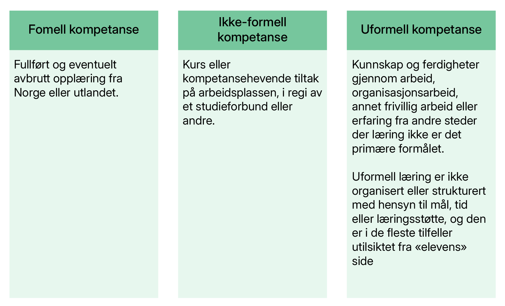 Realkompetansen er både den formelle, uformelle og ikke-formelle kompetansen den voksne har. Dette går frem av forarbeider til opplæringsloven § 18-8. Det avgjørende er om realkompetansen er likeverdig med kompetansen man får gjennom grunnopplæringen, det vil si kompetansemålene i læreplaner i fag eller moduler.