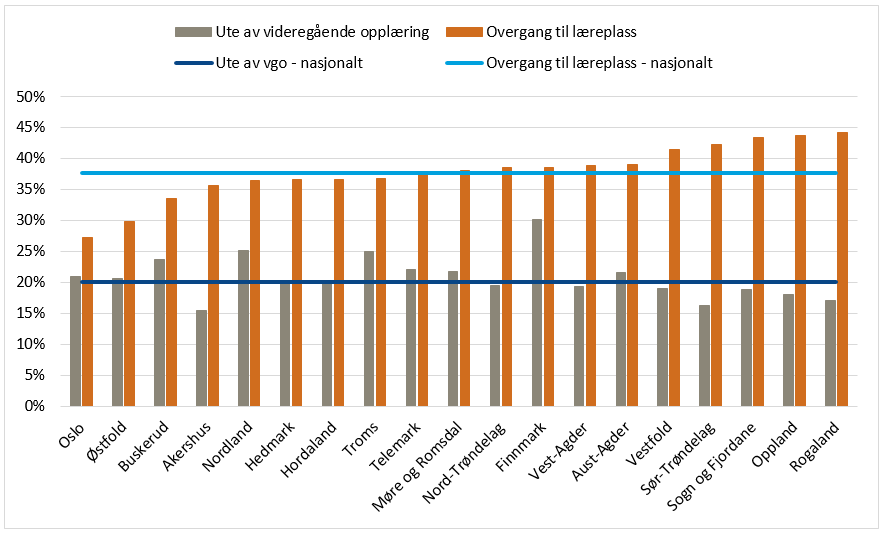 Det er færrest av elevene som begynner i lære i Oslo. Det henger sammen med at en relativt stor andel av yrkesfagelevene her går medier og kommunikasjon hvor ytterst få begynner i lære. Flest har fått læreplass i Rogaland. 44 prosent av Vg2-elevene her går i lære året etter Vg2. Totalt har 38 prosent av elevene overgang til læreplass.