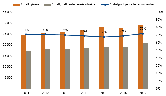 Antallet godkjente lærekontrakter har økt i perioden fra 2011 til 2017. Ved utgangen av 2017 hadde 72 prosent av søkerne fått godkjent lærekontrakt. Det er den høyeste andelen vi har registrert siden målingene startet i 2011.