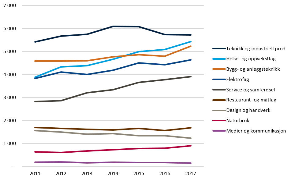 Det er flest søkere til læreplass innen teknikk og industriell produksjon. I dette utdanningsprogrammet, som har mange lærefag knyttet til oljeindustrien, var det en stor økning fra 2011 til 2014, mens det siden 2015 har vært en nedgang i antall søkere. Fra 2011 til 2017 har naturbruk, helse- og oppvekstfag og service og samferdsel hatt en særlig stor økning, alle rundt 40 prosent. Design og håndverk, medier og kommunikasjon og restaurant- og matfag har hatt en nedgang i antall søkere.