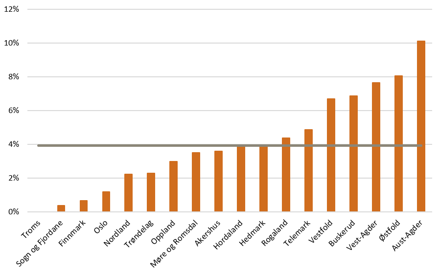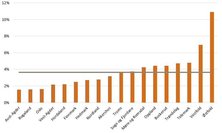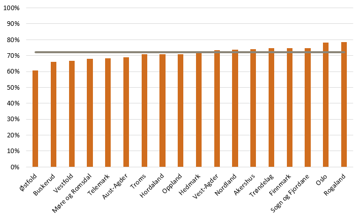 Det er store forskjeller mellom fylkene i hvor stor prosentandel av søkerne som får læreplass. Det er 18 prosentpoeng forskjell mellom Østfold, hvor lavest andel får læreplass, og Rogaland, hvor størst andel får læreplass. I Rogaland har 78 prosent fått læreplass, i Østfold 61 prosent.