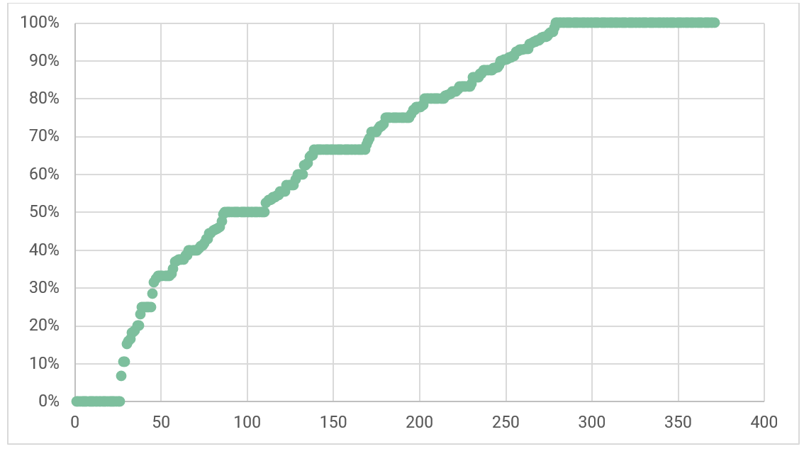Figur 4. Plottdiagram med kommuner og andel barnehager som oppfyller pedagognormen uten dispensasjon. 2020.
