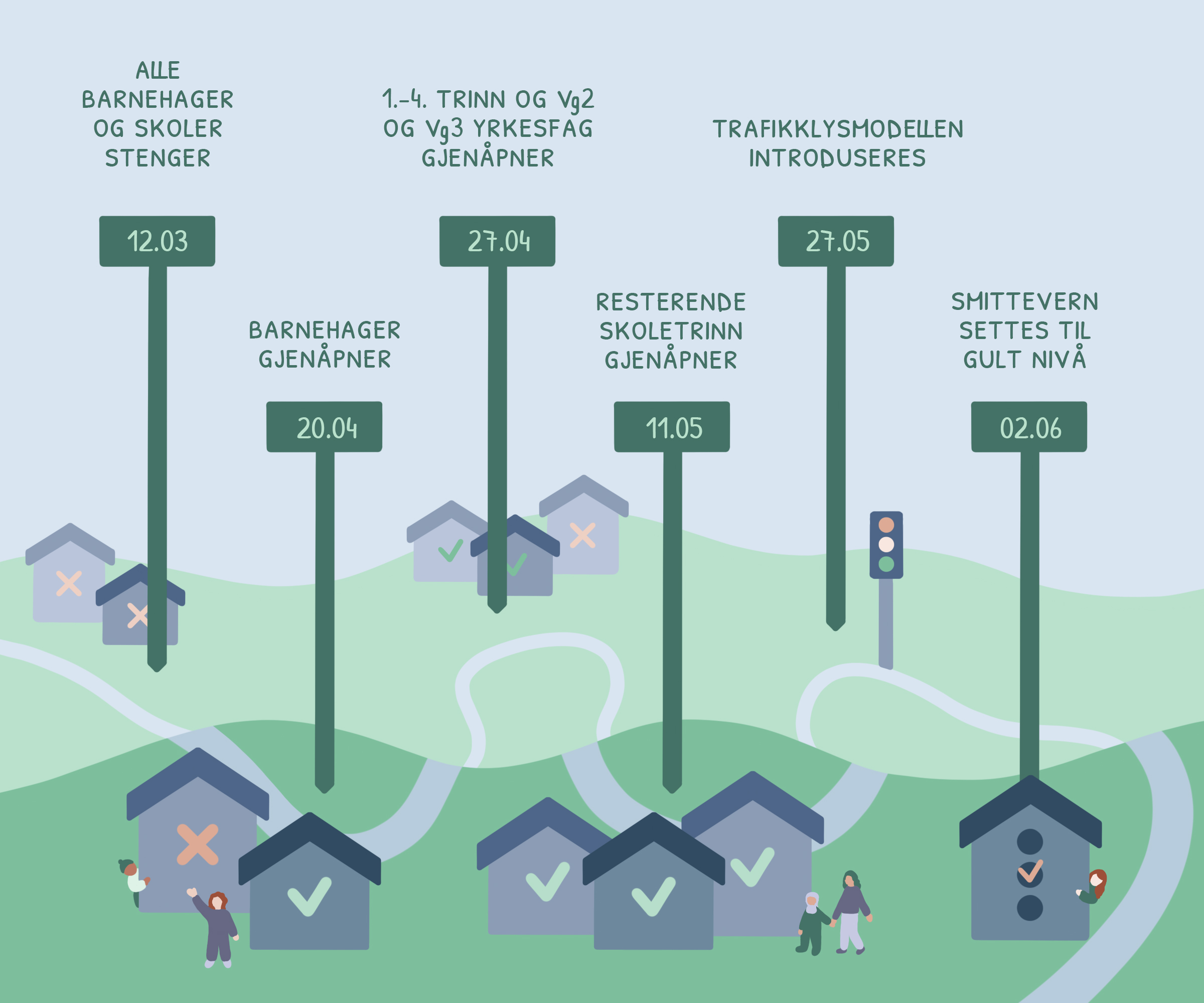 Til gjenåpningen ble det utviklet egne smittevernveiledere som skulle hjelpe barnehager og skoler til å håndtere koronasituasjonen. Smittevernveilederne gjør det mulig å tilpasse smitteverntiltakene til den lokale smittesituasjonen. Veilederne skal hindre at barnehager og skoler blir stengt, gjennom en nivåinndeling av tiltakene i en trafikklysmodell med grønt, gult og rødt nivå.