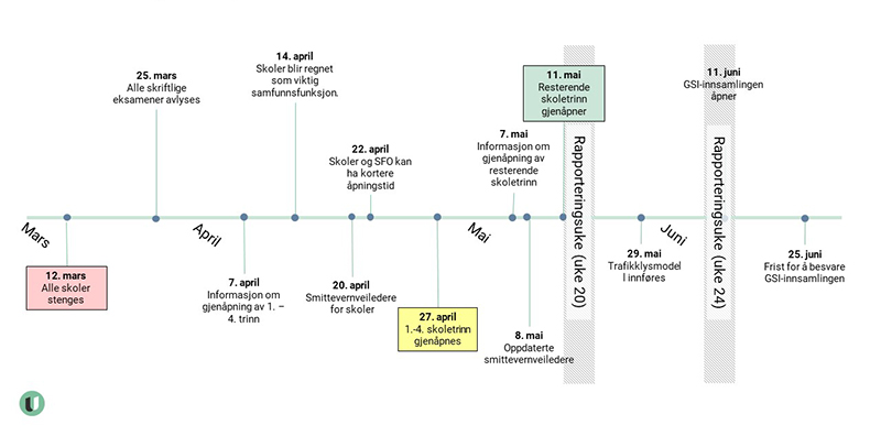 Tidslinje med utvalgte tiltak i grunnskolen under koronautbruddet våren 2020